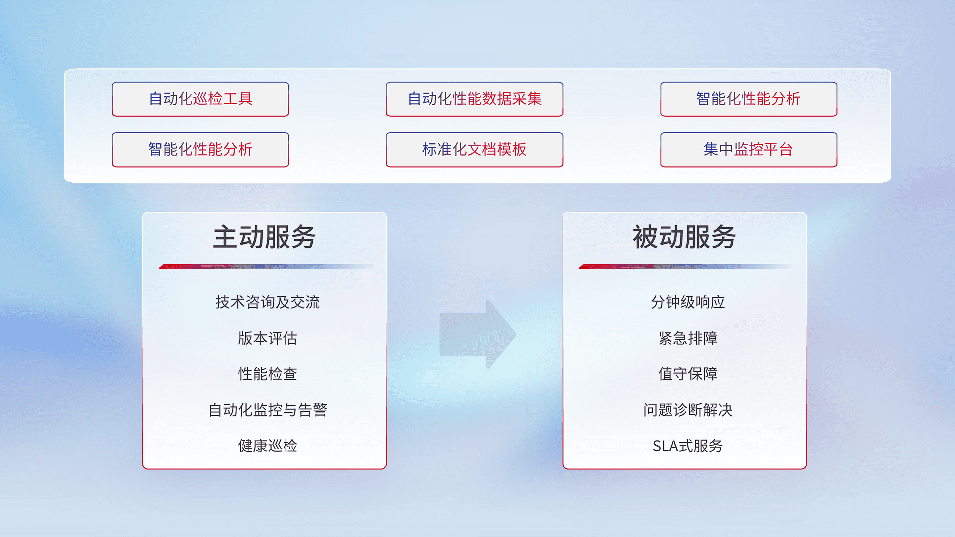 智能化工具和标准化文档,,,保障服务质量,,提供主动服务(包含技术咨询、、、、版本评估、、、、性能检查、、、、自动化监控与告警、、健康巡检)和被动服务包含(分钟级响应、、、、紧急排障、、值守保障、、、、问题诊断解决、、、、SLA服务)。。。